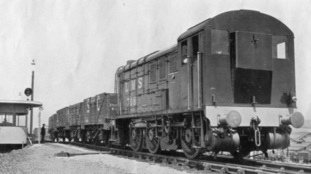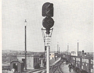 | Once the couplings had been unhooked between wagons of different destinations, the leading wagon in each cut was chalked with its siding number large enough for the hump operator to see as the wagon passed.When the operator was ready to shunt the train, he would give the 'proceed' indication on the 'Toton' signals, and the shunter driver would start slowly pushing the train up the hump. The shunters were 350hp and carried enough fuel for a week. | Normal humping speed would be just under 2 mph, indicated by a vertical line of white lights.The signal could also indicate a slow shunt (about 1 mph) indicated by a diagonal line of white lights. The shunter driver would obey the 'Toton' signals throughout 'humping'. Remember he could not see ahead to where the front of his train had reached! The shunters had accurate 0-2 mph speedometers. |
