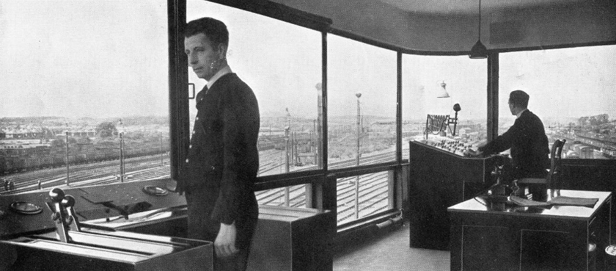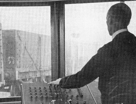 Here we see the operator in the Hump Room placed at the top of the rise. Looking through the wide windows of this room, he could plainly see the siding number chalked in large letters on the leading wagon of the 'cut'. He set the first 3 points (called king, queen and jack) and then sent the siding number and number of wagons in the cut on to the Control Room (next image). He would repeat this for every cut till the train had all been shunted. |
