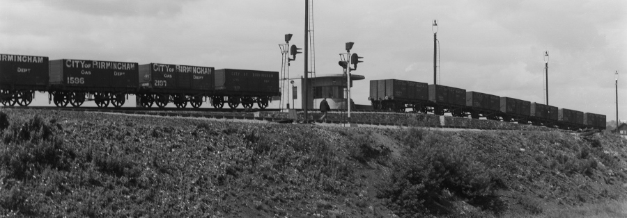 | This image also gives you an idea of the change in gradient after the downside hump .. large indeed by railway standards. Note this train has wagons from Birmingham and so would have arrived on the low level line. A shunting engine would have pulled it up on to the hump approach road before starting the humping. (SSL 26081) | |