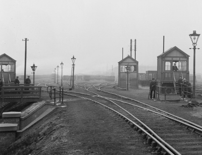 | Looking towards Long Eaton on the Down Side Hump. Wagons would roll down the hill towards the camera. You can see the starting points and the ground levers used to change them thus directing the wagons into their correct destination sidings. The large buiding in the far distance is a hostel for railwaymen needing overnight accomodation. At one time it seved as Long Eaton High School. | Here we are looking at the top of the Down Hump around 1910 taken from the Long Eaton end. Several Point Boxes can be seen. A good provision of gaslights allowed shunting to continue into the evening and night shifts if necessary. On the left can be seen the culvert built to take the River Erewash under the sidings. (SSL 8873) |