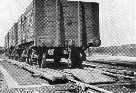 The 4 retarders were placed between the second "Queen" and third "Jack" points. They were 62 ft long of the Frolich (German) type working on compressed air. Brake-rails on each side of the running rails grip the wagon wheels at pressures determined by the operator of the brake levers in the control tower. Above we see a control room operator standing at the brake console. There are 4 levers, one for each retarder. The operator watched each cut descend the hump and had one chance only to modify their descent speed before they entered the siding selected by the points man seen on the far side of the room. One of the many factors operators had to bear in mind was that greased axle boxes wagons moved much slower than oiled ones especially in winter. At night special high intensity lighting was essential to give operators a clear view below. If the cut was destined for a siding that was nearly empty it would need more momentum to reach to the end. If the siding was nearly full, heavy braking was essential to avoid a harmful jolt when the moving wagon met the end of its train! |