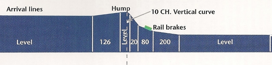 | Here you can see a wagon passing over a retarder and the rail brake gripping the wheels to brake the wagon. This 'cut' has 3 wagons. | This picture was taken during the construction of the new hump with an engineer's train going over. You can easily see the abrupt change of slope after the summit is reached. |