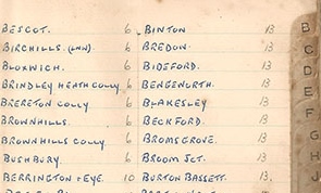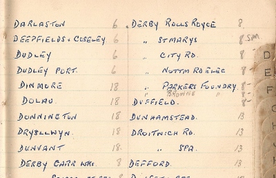 | One of our most exciting finds was lent to us by John Redgate of Long Eaton. His father Ted worked as a shunter chalker for many years at Toton. The pages shown are scanned from a notebook he made to remind himself of all the many siding destination numbers at Toton. | Ted had to check all the small destination labels of incomong wagons approaching the hump and chalk up the siding number they had to go to. Staff in the Hump Room would read these as the wagons approached them. You get some idea of all the many destinations. Ted didn't quite complete his book! |