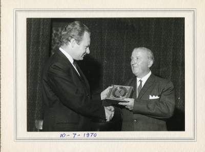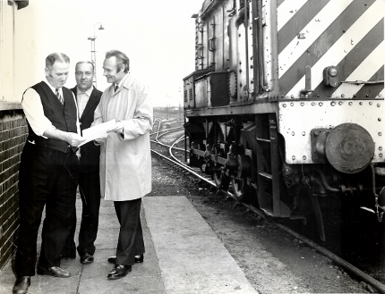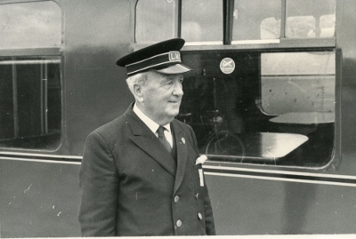 | Walter Amos receiving his presentation clock on his retirement. His son Brian was a keen railway enthusiast and made Toton Sidings something of a cause celebre in the district. He provided very useful inputs to our project in its early stages. | After his retirement, Walter enjoyed helping out as station master at Butterley Station, part of the Midland Steam Railway |