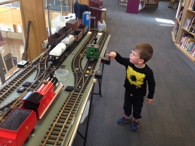 Stapleford Library June 2018 During the day at the library the pre-school age group had the railway to themselves and proved very enthusiastic! This venue confirmed that we needed a good 5 metres and we dispensed with the home-made trestles used before for the sidings. |