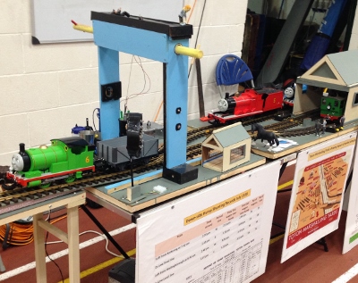 Garage Workshop April 2018 Here you can clearly see the hump which remains an important part of this popular layout and the spring & block used to compare loco pulling powers |