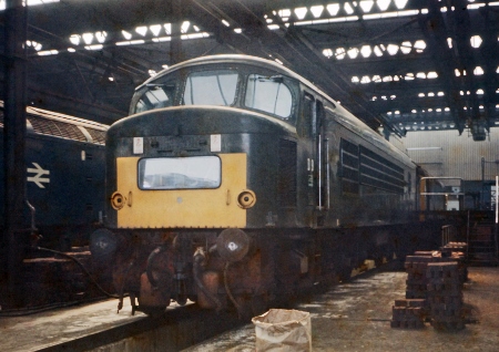 | Among the first diesels to arrive at Toton were the Brush Type 4s (later Class 47) but Toton will always be remembered for the Class 44 'Peaks'. All ten were shedded at Toton after spending the first two years of the 60s on the West Coast Main Line. | If a Peak went out at times when power was short, managers could rely on their quick return as no other depot had the staff who could drive them! While 44003 was withdrawn in July 1976, the class lasted at Toton till 1980. | ||||