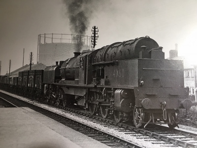 | To work with the Garratts, the LMS built a heavy 2-8-0 freight locomotive, the 8F, of which several are lined up here at Toton by the coaling plant. It was the design of William Stanier, who came to the LMS from Swindon in 1932, | Here an 8F trundles through Stapleford & Sandiacre Station on its way north with a long train of empties. These engines were well liked by crews with their reliability and generally good steaming | ||||