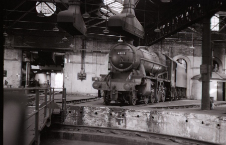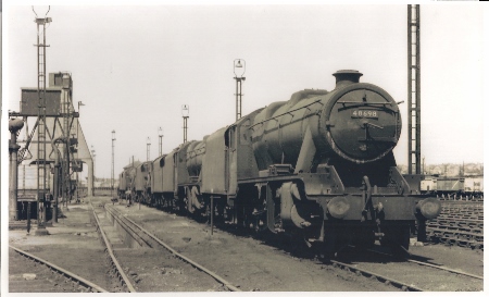 | Toton sheds were built on the Roundhouse pattern with one road in and then the turntable as shown here. The turntable was turned to point to the required stabling road. | The 8F was also well liked by the maintenance staff and you can see the high running plate gives good access to the loco motion. They continued working right up to the demise of steam in the 60s. | ||||
