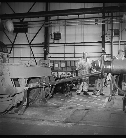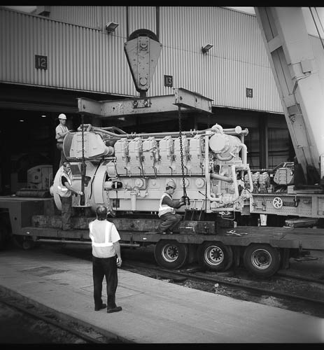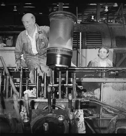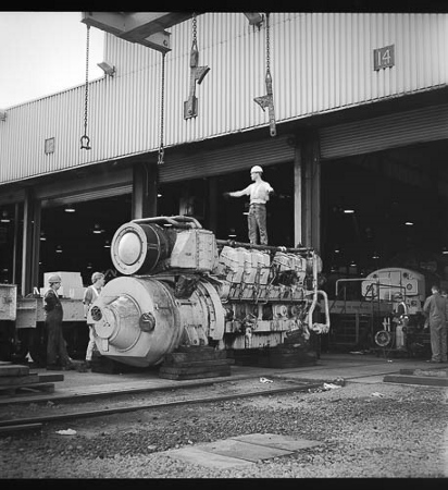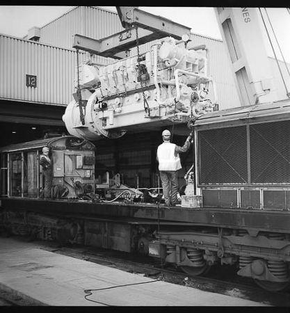 | Two class 56 locos share the lifting bay (13-15 roads) with an overhead crane, later replaced by a gantry. Most of the guys who worked in this section did so because they preferred it | During the F exam of a Class 56, a piston liner is winched out for replacement.The class had a 16 cylinder engine developing 5,000 hp! | ||||
