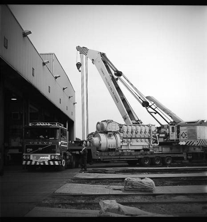 | A class 58 engine has been removed from its loco ready for shipping out for re-conditioning. The photo was taken around 1995 not long before BR was wound down/split up for privitisation in 1996. | A re-conditioned engine from Doncaster is hoisted from a low loader by a 76 ton breakdown crane ( a crane was later installed inside the depot). Such work (Level 5) was not done at Toton at that time. | ||||