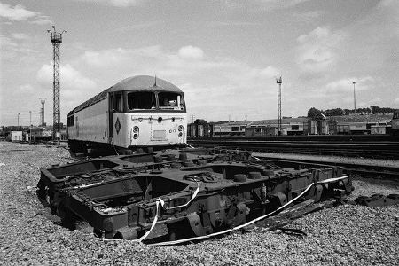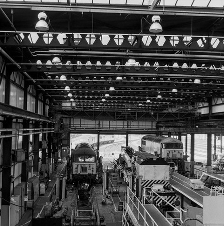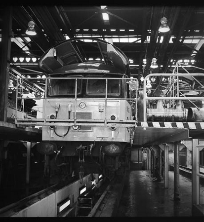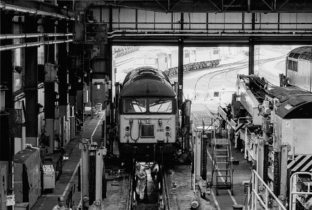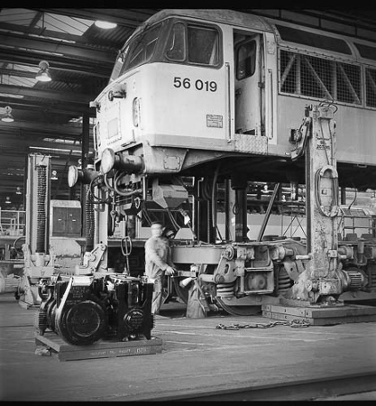 | This shows a brilliant solution to moving bogies in pairs at the lifting bay and a purposely designed bar and bracket for loco attachment. It gives an idea of the level of skill and ingenuity people had at this depot. | A Class 56 is undergoing an F examination. Note the removed roof panel is stored above the engine to save space on the depot floor. Another useful home-grown idea! | ||||