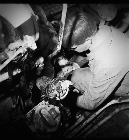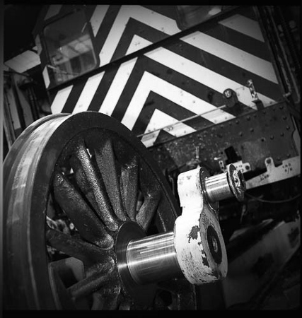 | Part of the wheel set of a Class 08 diesel shunter removed for attention on the lifting bay. These shunters did all the hump shunting at Toton. | A fitter at work in the engine room of a Class 56 diesel. They had to work in cramped conditions often with heavy components to manipulate. | ||||