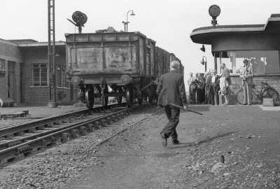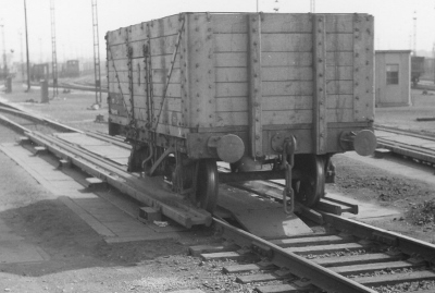 | This picture shows how large the wagons were. Imagine a series of these running downhill and then being asked to run alongside them in order to steady them. This was done with a stout brake stick jammed above the handbrake lever mechanism! | After modernisation, 4 retarders were installed to help set the speeds at which rolling wagons entered their destination siding. If the siding was fairly empty the wagon would need to trundle a hundred yards or so. If full, it would soon meet up with a stationary wagon so would need to enter slowly. |
