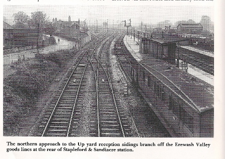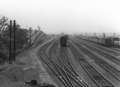 The approach to Arrival Lines: Freight took the station-avoiding road at Stapleford & Sandiacre, then a bend to the left brought you to one of the 12 arrival lines. Note Bessel Lane on the left which is now the route to the UPS Depot for parcel mail. |