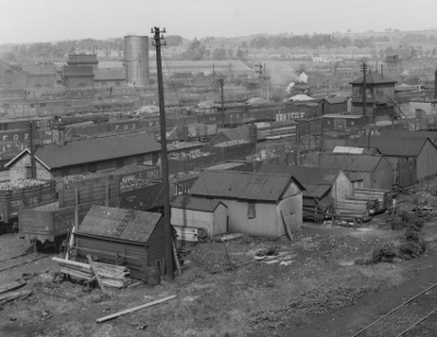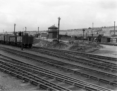 | The wear and tear on coal wagons largely constructed of timber and used in all weathers and seasons was very hard indeed. Thus there were always large numbers of 'crippled' wagons to be repaired and very soon Toton was host to a large number of private and railway repair shops as seen here. | The repair shops were mainly located adjacent to the departure sidings for Up traffic (southbound). Here we see the Upside Centre Signal Box and the repair shops looking across the through lines. Errors in shunting, sometimes called rough shunting, were inevitable especially with gravity shunting and this added to the repair list! |
