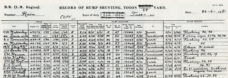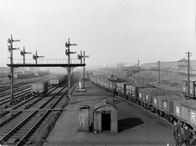| Detailed records were kept of the shunting progress each day occasionally disrupted by a derailment! There were 37 sidings in all and interestingly the lines from the West Yard dipped to meet the main lines while those on the east side rose at 1 in 320 to reach the High Level line out of the yards. They dealt with around 70 incoming trains a day and 60 going onwards. | |